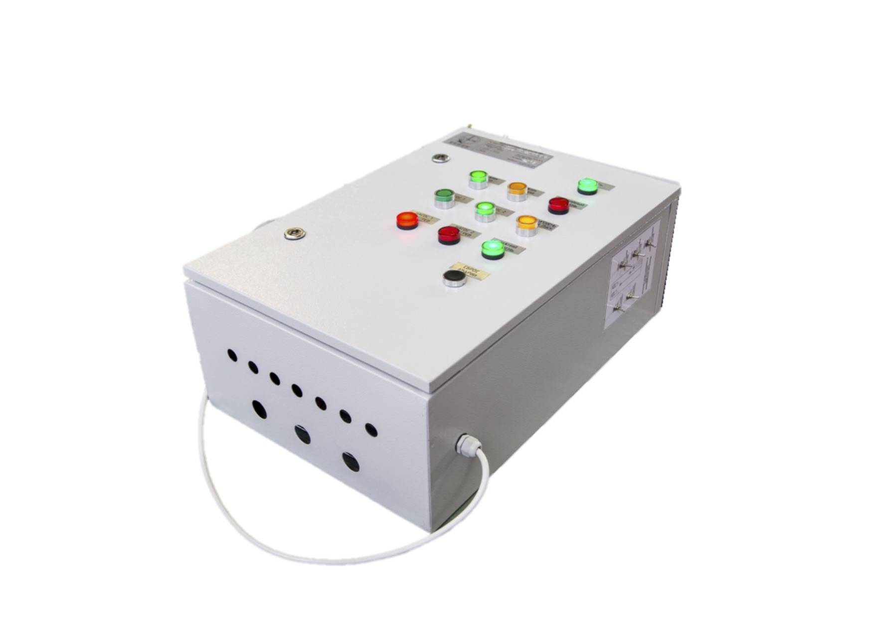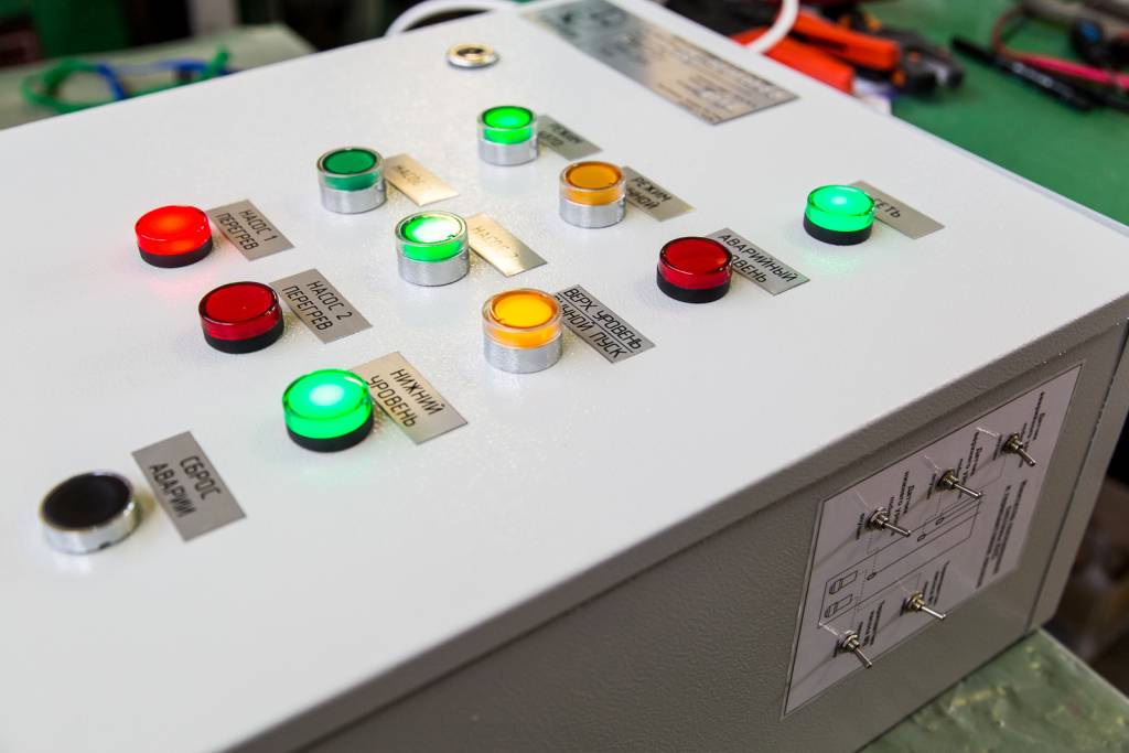 Шкаф управления анализирует сигнал от поплавковых датчиков, и перерабатывает его в команды, такие как: